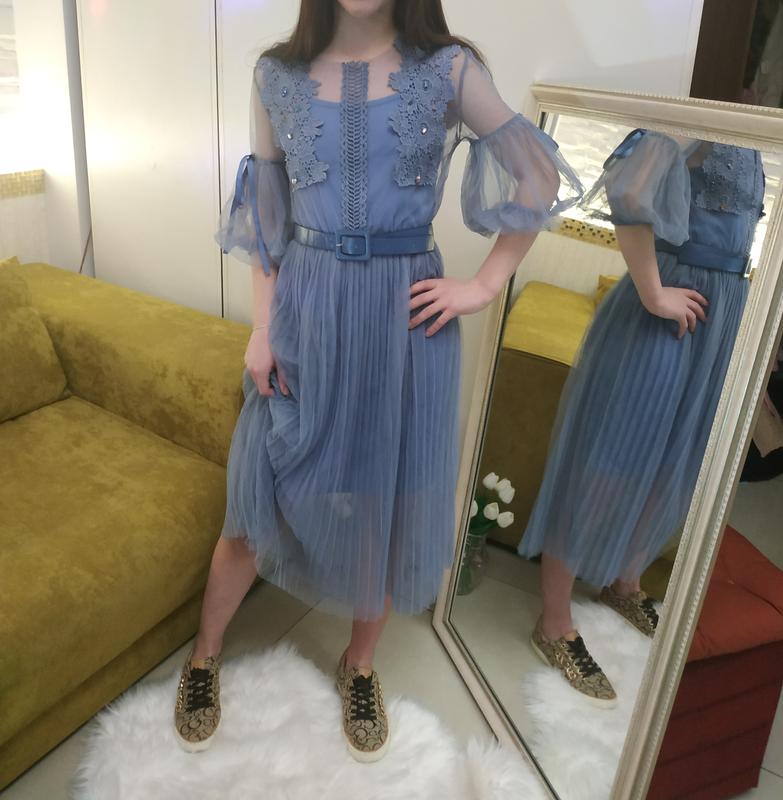серо- голубой цвет. низ Плёсе двойное. фото на модели смотрите. есть пояс в цвет.