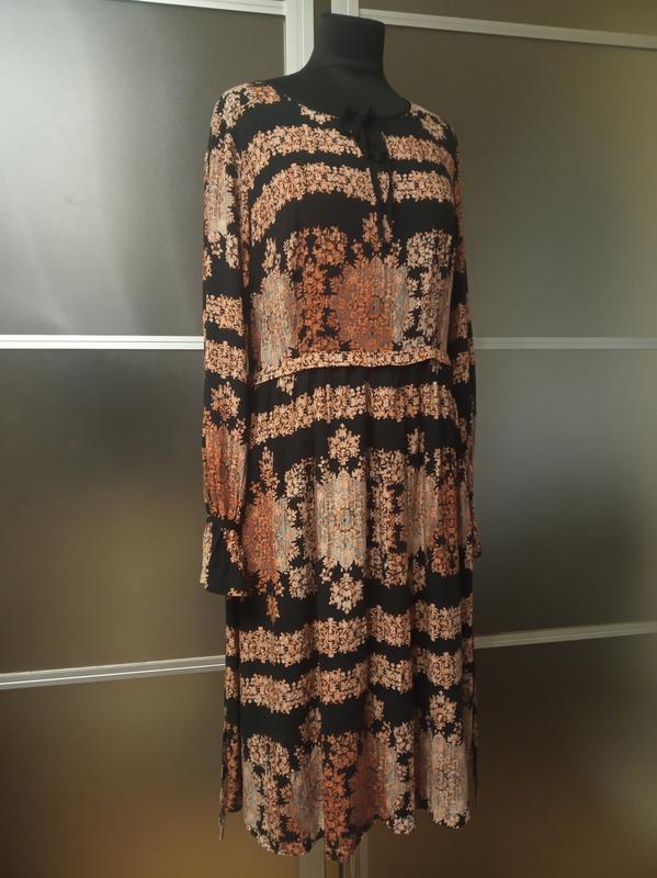 Красивое платье из струящейся ткани( 100% вискоза) с длинным рукавом, полностью на подкладке, сбоку потайная змейка. ПОГ 52, ПОТ 44, плечи 42, длина рукава 66, длина 106 см.