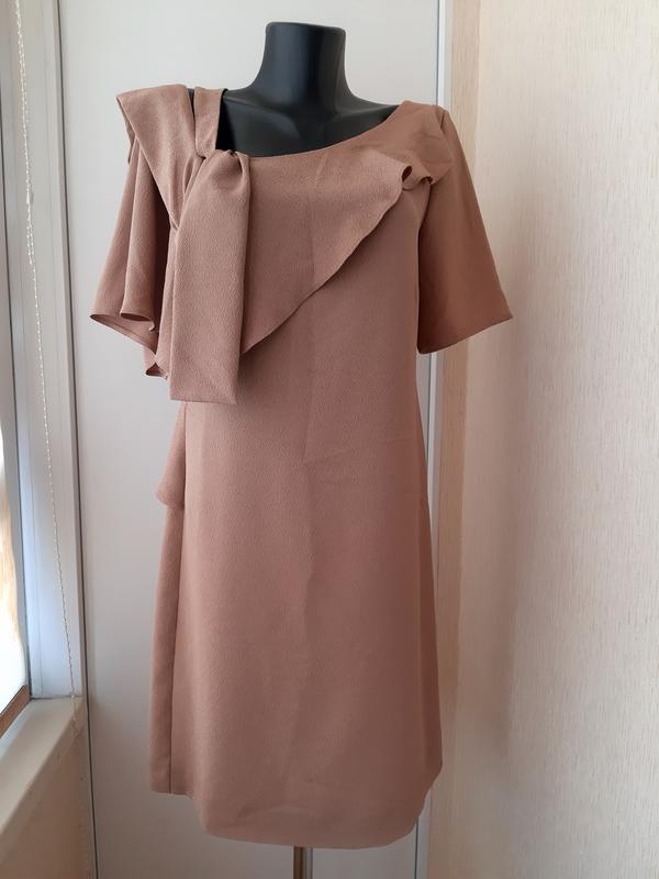 Оригинальное платье от Max&Co с интересным фасоном. Красивый волан, переходящий в один из рукавов можно по-разному драпировать при помощи ленты. Можно завязать бант или выпустить ее сверху. Каплевидный вырез на плече сзади и такде ниспадающий волан создадут Ваш неповторимый образ. Длина 88 см Полуобхват груди 44 см Платье прямого кроя Размер 40 итальянский