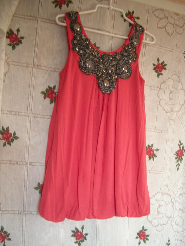 Шикарное платье красивого цвета,то-ли розового,то-ли красного-что-то среднее,фирменное,натуральное,на натуральной подкладке,спадает складками вниз,внизу на резинке,впереди чудная аппликация из тесьмы с черно-серебристой нитью,выложены цветы,фигуры и на них цветочки,фигуры из черно-серебристых пластинок,объем груди-82см.,длина платья-75см.