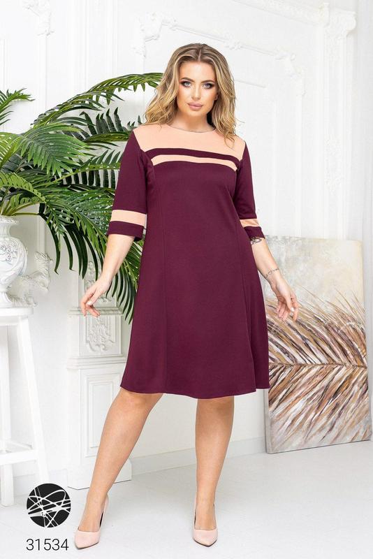 Сукня з контрастними вставками. А-силует, круглий виріз, рукава три чверті, ззаду застібка на потаємну блискавку. Орієнтовні заміри по готовому виробу: 50 (ОГ-104, ОТ-96, ОБ-114); 52 (ОГ-108, ОТ-100, ОБ-118); 54 (ОГ-112, ОТ-104, ОБ-122); 56 (ОГ-116, ОТ-108, ОБ-126). ДОВЖИНА:100 см ДОВЖИНА РУКАВА (ПО ВНУТРІШНЬОМУ ШВУ):20 см Колір: малиновий, темно-сірий