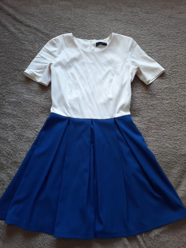 стан ідеальний, розмір с-м, колір зверху молочний,низ насичений синій(електрік),висіло в шафі тому помнуте треба просто розпрасувати, без плям та дефектів, ззаду від талії до верху на замку, підійде ідеально як під туфлі,босоніжки,так і під кеди