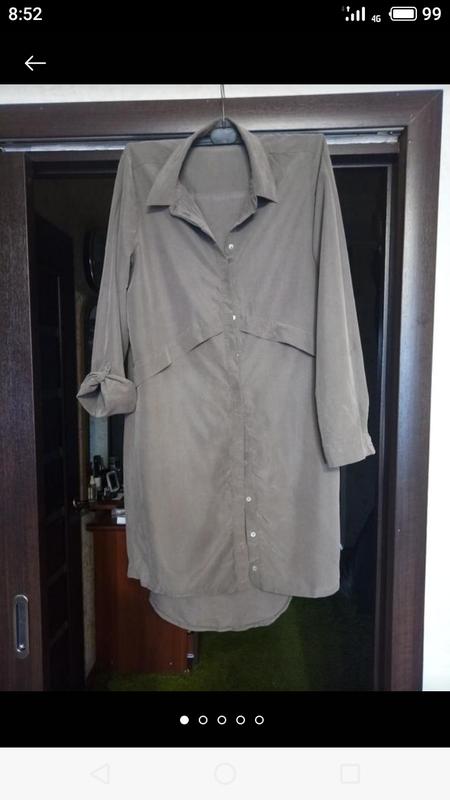 Платье рубашка, цвет немного темнее чем на фото, серооливковый я бы сказала длина впереди/сзади 92/104, ОГ 55, талия 53, бедра 55,, рукав 63, плечи 41.