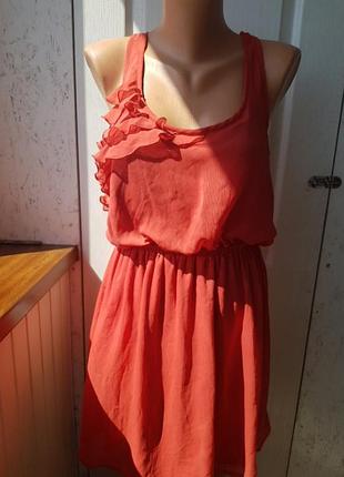 На бретелях,спинка открытая,цвет-коралловый,ткань-шифон,на чехле(не просвечивает,талия на резинке ).Длина-88см,ПОГ-51см(тянется)