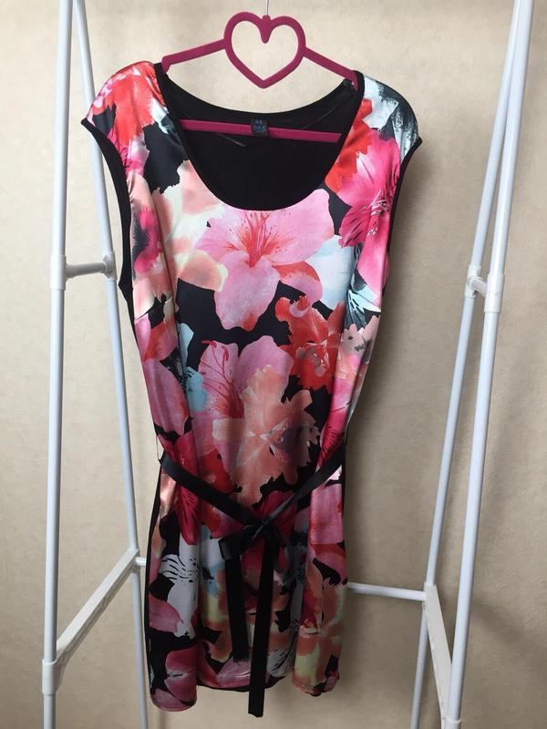 Новое, но без бумажной этикетки. Тянется только спинка. Для груди есть выточки .Длина 90см, ширина под рукавами 54см, ширина в бедрах 60см. Можно носить под поясок и без. Указан 44 европейский размер, в облипку быть не должно. На наш 50/52 подходит