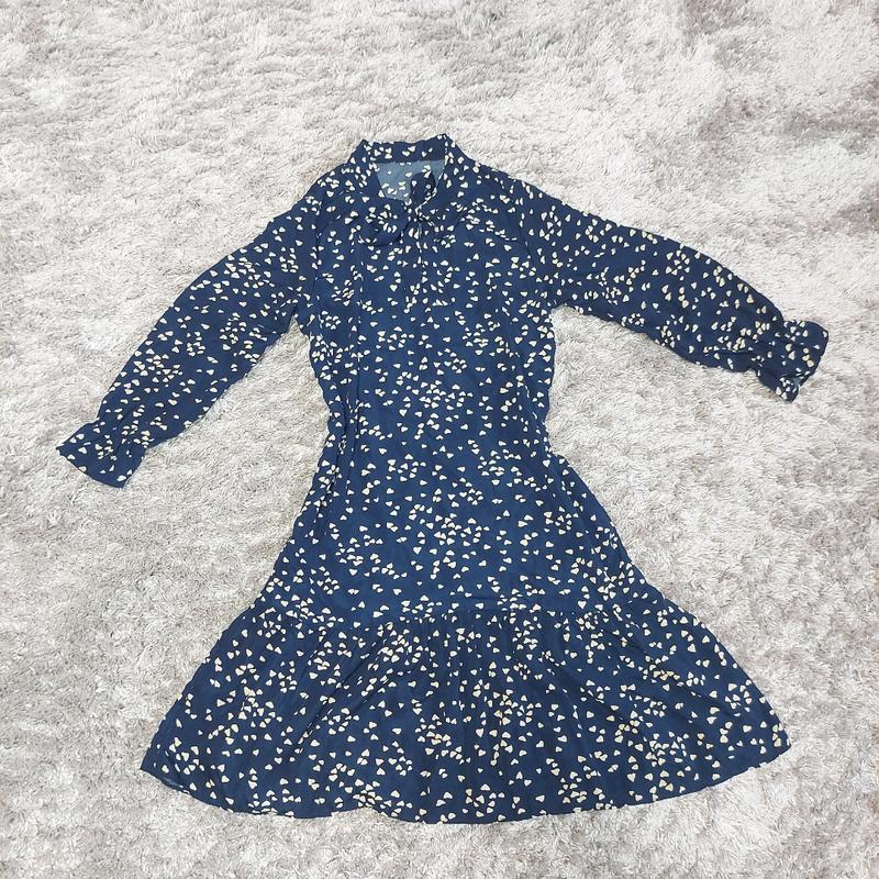 Платье новое, собствственного пошива для производства, поэтому нашивок, бирок нет Состав полиэстер, крой свободный, можно под поясок как на фото. Не мнется. Цвет темно-синий в сердечки. Под горлом завязывается на ленту в бантик. По юбке волан, по рукавам сборкой с резинкой. Размер на наш 46 (М-L), не тянется Надето на рост 177см, бедра 98см, талия 74см, грудь 96см ‼️Замеры‼️ Длина 104 см, плечи 37см, грудь, талия, бедра полуобхваты 51 см, рукав 54см