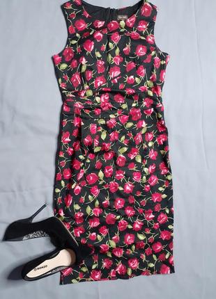 дуже красиве і стильне плаття, в квітковий принт, верхня частина йде на підкладці, довжина 101, пог 44, піт 34, побіди 45, застібається на змійку ззаду, є розріз, тканина бавовна і еластан