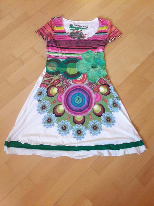 Платье размера L, маломерит, реально на М. Бренд Desigual. Дефектов нет. ПОГ 46 см, ПОТ 39 см, ПОБ 59 см, длина до талии 35 см, общая длина 96 см.