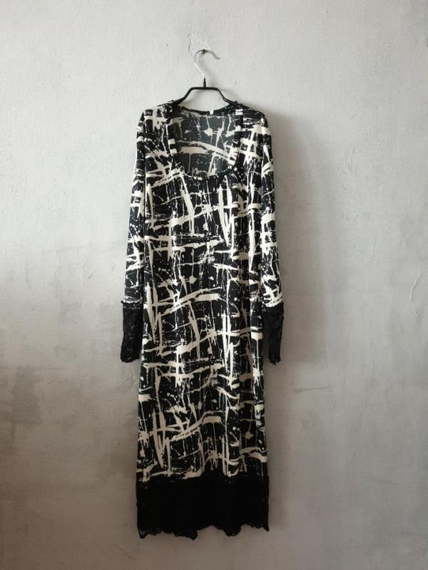 Дуже класне платтячко, знизу і на рукавах оздоблене ажуром .Тканина тягнеться і легенька.Заміри надам при необхідності