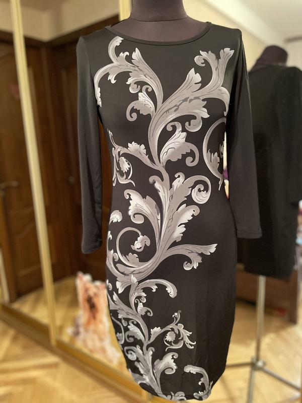 Милое чёрное платье с рисунком. Красиво сидит по фигуре.