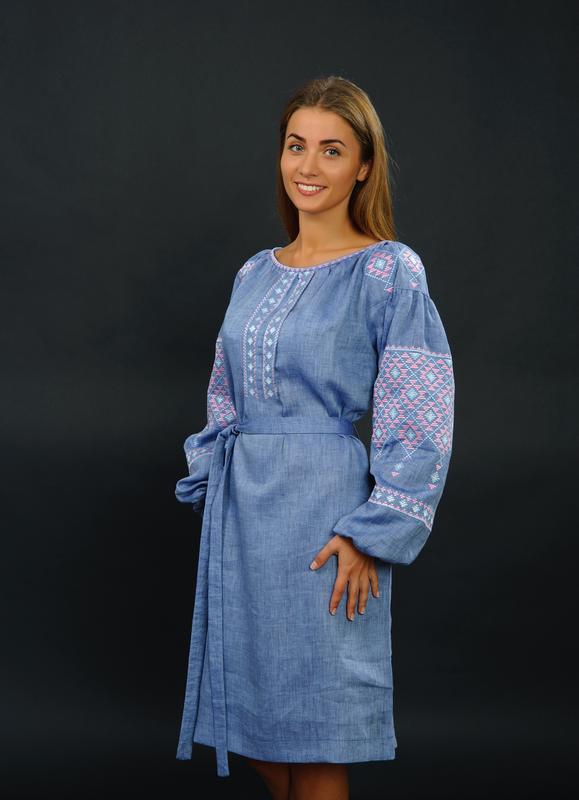 Сучасний геометричний візерунок ніжно-рожевого кольору ідеально поєднується з м'яким тоном блакитної тканини, що додасть навіть дуже жіночному образу ще більше витонченості і легкості. тканина 100% льон дуже гарна ціна розміри 42-56 заміри надам