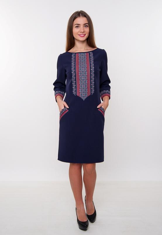 синє вишите плаття футляр,3/4 рукав ,косі кишені, ідеальна знахідка нащодень Фасон приталений, завдяки виточкам на спинці і грудях добре сідає по фігур розміри 42-52 заміри надам,додаткові фото також