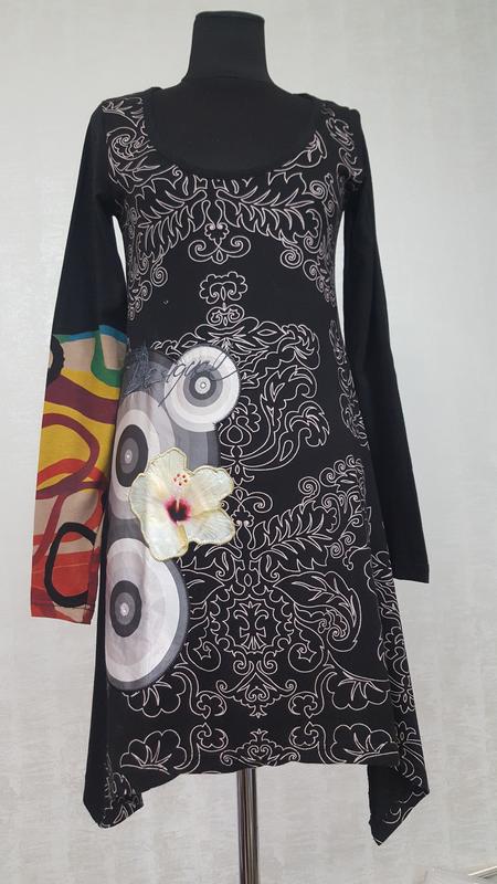 Красивое и стильное трикотажное х/б платье от мегапопулярного испанского молодёжного бренда модной одежды Desigual.В переводе с испанского языка Desigual означает "уникальный". Перёд с узорчастым принтом, спинка чёрная.Низ ассиметричный.Декорировано аппликацией,вышивкой,стразами. Состояние новой вещи.Из-за того,что срезана внутренняя бирка, ставлю состояние "идеальное",а не "новое". Размер S пог 42-45 см пот 38-41 см поб 47-50см др 61 см ди 96-84 см Будет ещё много фирменных вещей. Подписывайтесь! Имейте ввиду, что пока вы добавляете товар в ''избранное '',кто-то его уже покупает.И вы можете упустить свой шанс приобрести понравившуюся вещь. Дешевле покупать сразу несколько вещей-таким образом вы экономите на доставке. При покупке трёх и более вещей и оплате на карту продавцу сразу-- доставка бесплатная Удачных и приятных покупок!