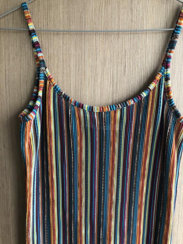 Цветное,лёгкое и яркое платье с необработанным краем по низу. Ткань тянется. В меру просвещается. Под телесное белье идеально. Внизу по бокам 2 разреза. Подойдёт отлично от XS{будет свободно} до L{будет по фигуре}. Состояние идеальное. Ни разу не одето.