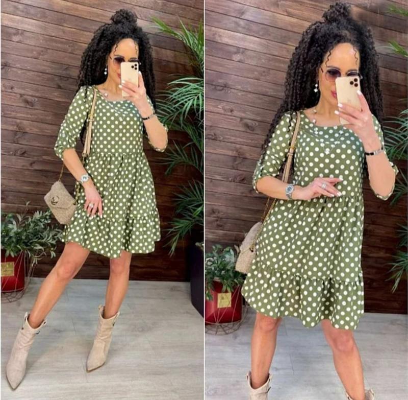 Летнее платье с оборкой "Алсу" Каждая женщина хочет быть женственной и выглядеть неповторимо. В свою новую модель "Алсу" мы вложили нотки романтичности и кокетливости. Это платье легко подчеркивает достоинства и скрывает недостатки, а принт в белый горошек создает игривое настроение и усиливает женственность. Женское платье в горошек выполнено из легкого софта, который широко используется в пошиве женской одежды. Он отлично пропускает воздух, идеально ложиться по фигуре и не прихотлив в уходе. Изделие свободного кроя с отрезной завышенной талией и с широкой оборкой снизу. Такой фасон удачно подходит для разных типов фигуры, ведь он помогает избежать ненужных акцентов в области талии, живота и бедер. Рукава по локоть можно присборить с помощью пуговиц и специальных шлеек, что вшиты с изнанки. ХарактеристикиСтиль:СasualСезон:ЛетоДлина от плеча:83-86 см Длина рукава:40-41 см Материал:Софт Наличие на складе Цвет 42 44 46 48 Темно-синий Хаки Капучино