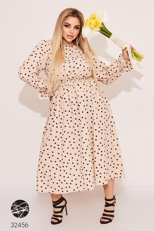 ЦВЕТ:бежевый ЦВЕТ ДОПОЛНИТЕЛЬНЫЙ:черный МАТЕРИАЛ:софт ЗАСТЕЖКА:на молнии СЕЗОН:весна/ лето СТИЛЬ:повседневный ЦВЕТ ДОПОЛНИТЕЛЬНЫЙ:черный ПАРАМЕТРЫ МОДЕЛИ НА ФОТО:110-85-114 см РАЗМЕР МОДЕЛИ НА ФОТО:52 РОСТ МОДЕЛИ НА ФОТО:175 О ТОВАРЕ Платье из качественного плотного софта с принтом в горох. Круглый вырез, объёмные рукава и талия на резинке, сзади застёжка на потайную
