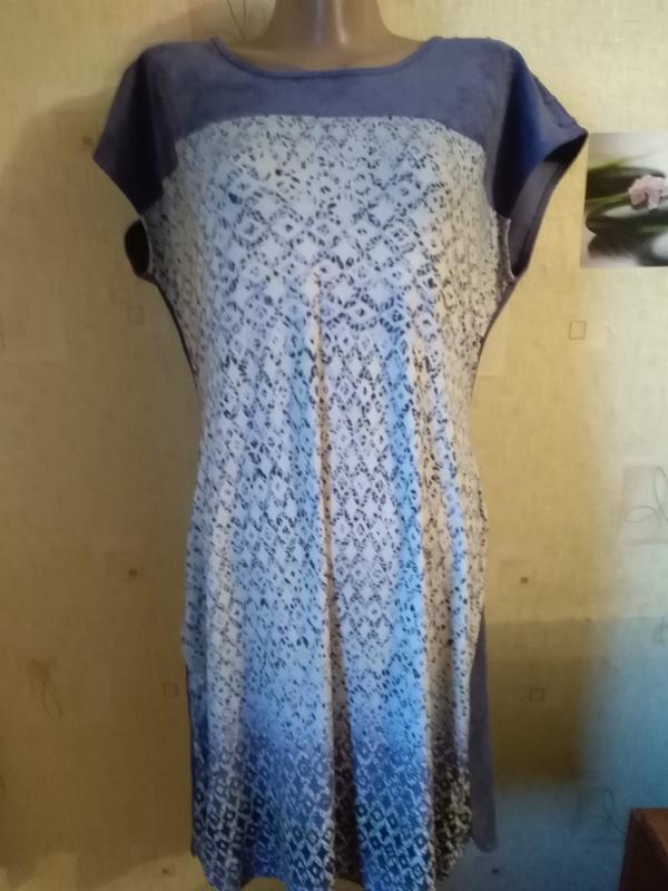 Летнее платье очень приятное к телу. Ткань :зад 90%полиэстер, 10%эластан ;перед 95%вискоза, 5 %эластан. Объем груди 104см,длина по спине 89см.Цвет серо-синий. Произв. Китай.