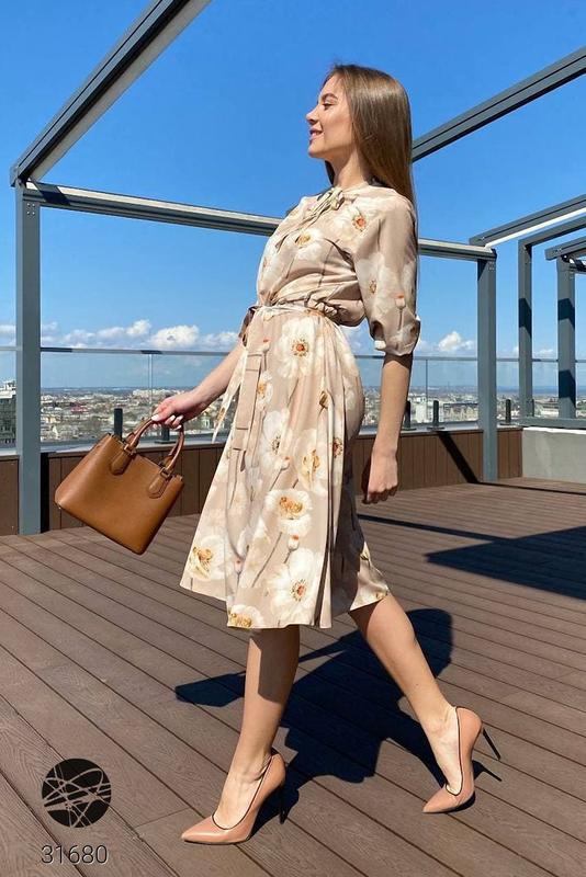 Платье свободного кроя с цветочным принтом. Вырез-капелька на завязках, рукава три четверти с фиксирующей резинкой. На талии резинка, в комплекте пояс из основной ткани.