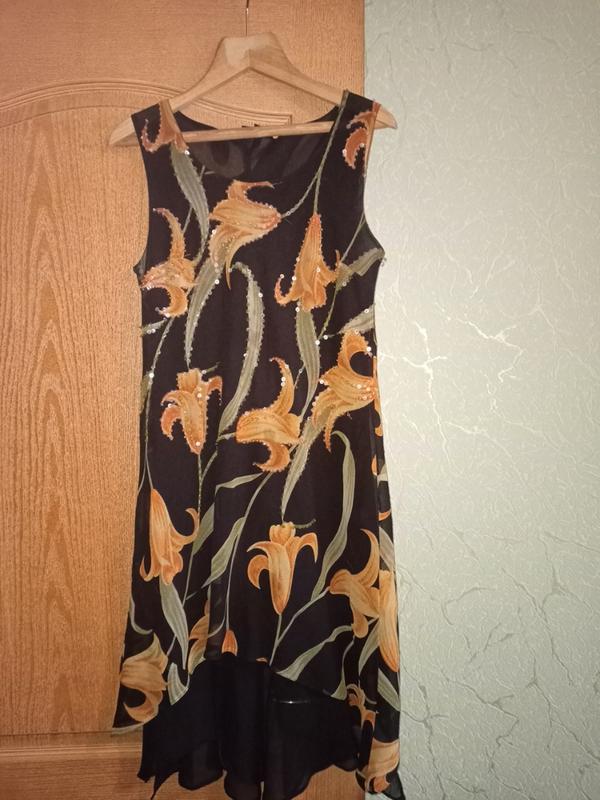Довжина 100 см загальна. Підкладка тягнеться, Сукня з газової тканини з розрізами по боках та зад-перед ніби клини. Окружність грудей 105-110 норма плюс 3 см можна. Ніби подовжене, але враховуючи розрізи то ніби то і міні. Дуже гарно, сексуально. Я виросла з нього, на жаль)))