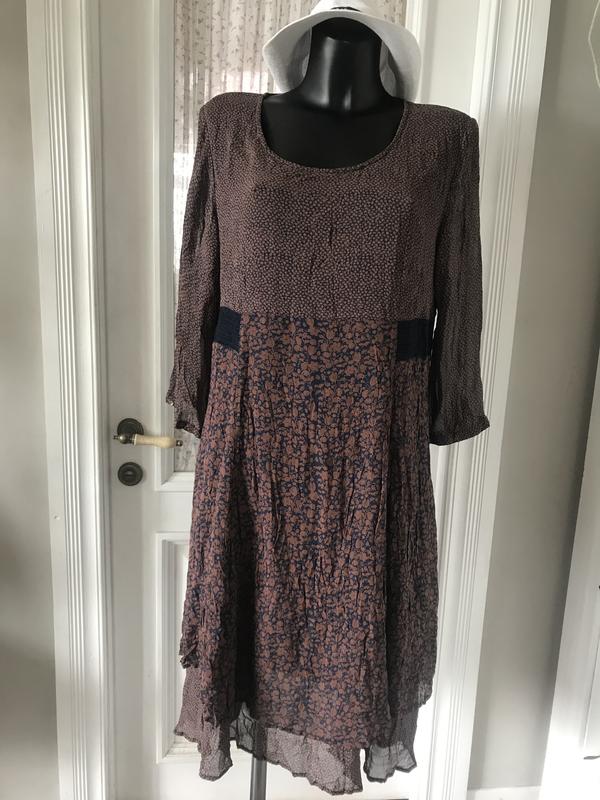 Стильне плаття від німецького бренду Simclan. Шикарна забарвлення, прекрасний стан виробу. Склад:віскоза -100/. Плаття на синій однотонної підкладці. Застібка-блискавка в бічному шві. , рукав-3/4. Якість на висоті! Розмір на бірці -42(німецька). Заміри:довжина-104 см, ПОГ-49 см, ПОБІДИ-58 див. Дуже красиве!