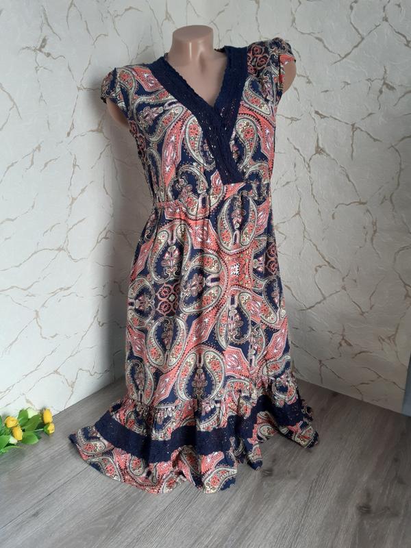 Платье отрезное по талии,верх на запАх (пришито). Пояс на резинке, по низу рюша . Длина от плеча до талии 33 см. от талии до низа перед 60 см. сзади 71 см. ПОГ 46 см. ПО талії 38 (тянется до 50) ПО стегон 61 см. Плечи 38 см Вискоза