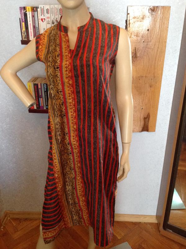 Тончайшее, очень эффектное платье - туника бренда Soch (Индия), р.46 Бирки с составом нет, хотя как стирать и ухаживать они написали, ну тут к гадалке не ходи - тончайший хлопок (прям просится название маркизет или кисея - красиво правда?) Этот индийский бренд не дорогой, конечно если не покупать шелковые изделия шитые золотом. Он удачно сочетает в себе традиционные мотивы с современной модой (на последних фото их работы). Мерочки: ПОГ 48см, ПОТ 4305см, ПОБ 49см, длина по спинке 111см, по бокам два больших разреза. Традиционный окрас (более глубже и контрастнее чем получился на фото). Прелестное платьишко, легонькое, тонкое, не жаркое.