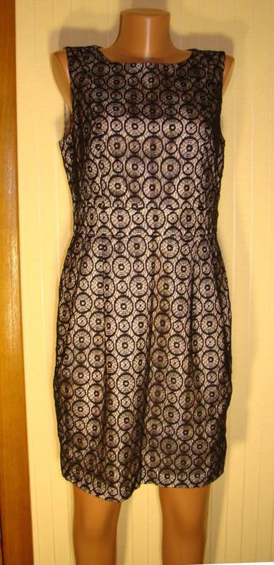 Сукня F&F. На підкладці. Підрізна талія. Спереду у спідниці, на рівні талії 4 защипи. Ззаду потайна блискавка 51 див. Знизу маленька шліца. Розмір 46. Ширина на рівні грудей 48 см. Ширина на рівні талії 40 см Ширина на рівні стегон приблизно 50 см. Ширина плеча 6 див Довжина від плеча до низу 90 см. Ціна 750 грн.