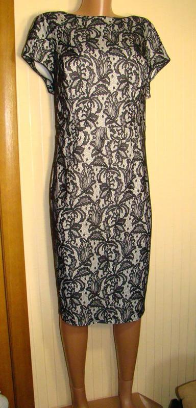 Платье F&F. Плотная, стрейчевая, трикотажно гипюровая ткань. Приталенного силуэта. Застежка на потайной молнии по боковому шву длиной 34 см. Размер 62 (XXXL). Ширина по груди 62 см. Ширина по талии 53 см. Ширина по бёдрам 62 см. Ширина плеча 7,5 см. Длина рукава 15 см. Ширина рукава внизу 20,5 см. Длина от плеча до талии 50 см. Длина юбки от талии до низа 63 см. Цена 680 грн.