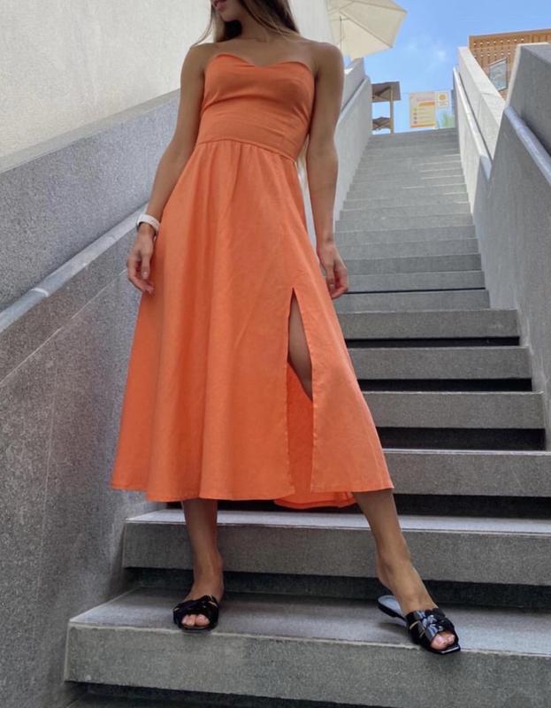 Платье миди яркое с разрезом бюстье открытые плечи , размер С, М, качество люкс, цвета оранжевый , чёрный