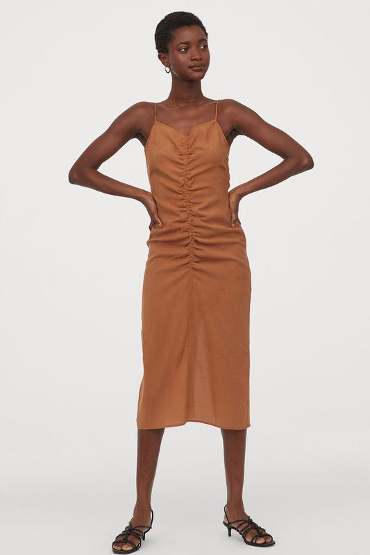 Платье с треугольным вырезом горловины из мягкой ткани из смесового Tencel™-лиоцелла. Узкие регулируемые бретели и присборенный шов вдоль полочки и спинки, что создает эффект драпировки. Потайная молния с одной стороны. Сзади разрез. Без подкладки.