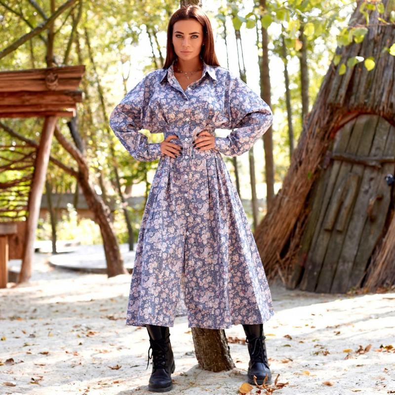 Современное и функциональное платье-рубашка с цветочным принтом сшито из коттона. Оно имеет сквозную застежку на мелких пуговицах. По талии сужено с помощью пышных вытачек-защипов. Объемные рукава скроены по типу летучей мыши, у запястья собраны широкими манжетами. Воротник классический рубашечный, на стойке. Юбка расклешенная, ее длина намного ниже колена. Платье имеет свободный крой, оно легкое, не сковывает движения при ходьбе. Рисунок ткани веселый и пестрый, он напоминает летний луг. Платье подойдет для летних прогулок, для свидания, для повседневной носки. Производитель: ТМ Elena Pokalitsina Модель:11644