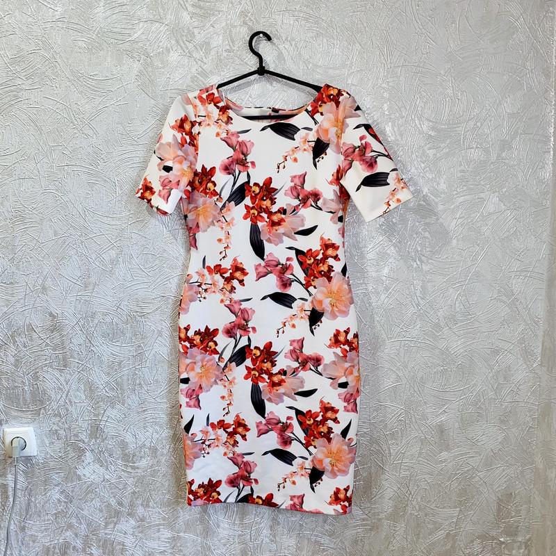 Платье идеально садится по фигурке , очень красивый цветочный принт, актуальный в этом году Длинна 100 По груди 45 и тянется Бёдра 47 и тянутся до 55