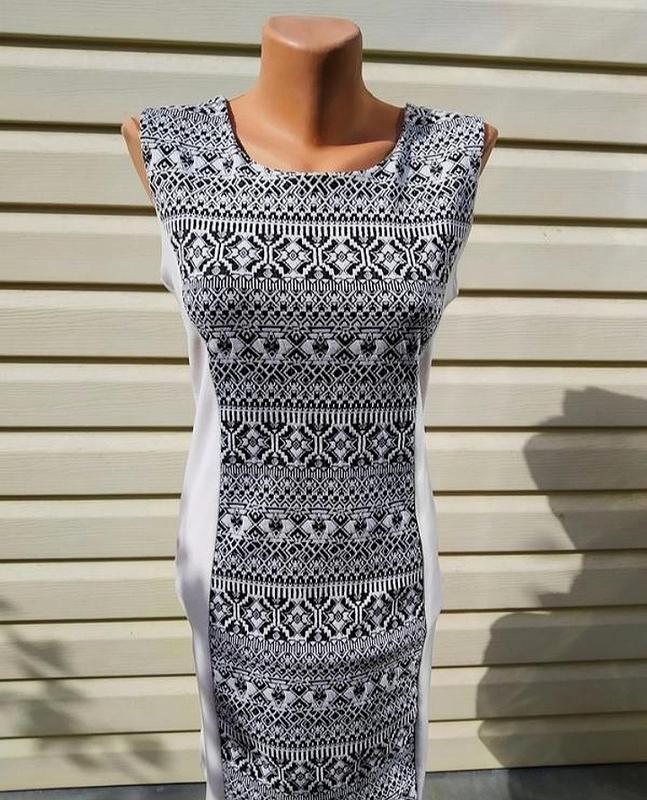 Женское платья безрукавка с орнаментом! по бокам белые вставки, приталенное,на спинке замок молния,очень красивое и нежное! Ткань трикотаж с добавлением стрейча!