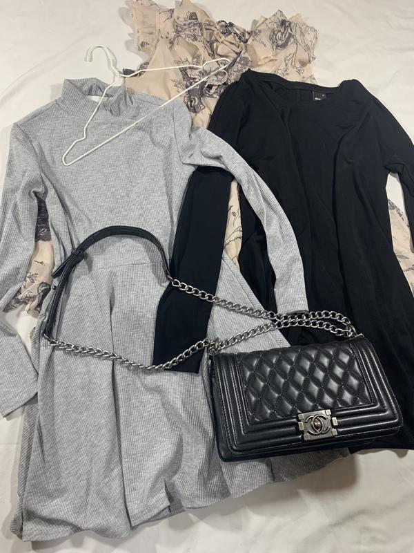 ТРИ ПЛАТЬЯ: -Чёрное - 150 грн Длина 76 см Грудь 54 см (но оно как оверсайз немного идёт) Рукав 54 см (но срез ниже плеча идёт) -Серое ASOS - 200 грн -Бежевое - 100 грн Отвечу на все вопросы