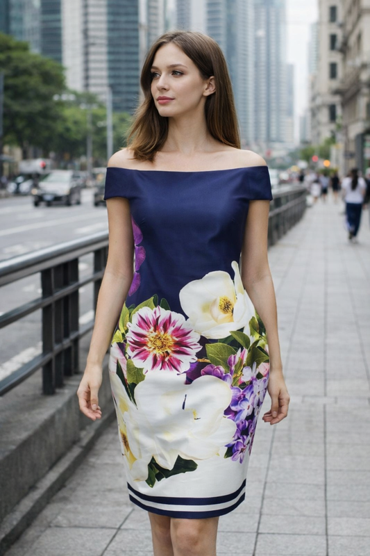Роскошное платье с открытыми плечами.С 3D принтом.Размер 16 Маломерит на 14.Силуэтная ткань.Змейка по спинке.Длина миди.Идеально сядет на XL.Платье новое. Бирок бум. нет.Пог 50 Пот 85 Поб 105 есть эластичность ....Бренд JW.