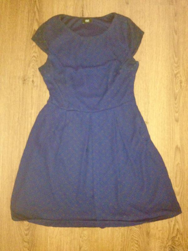 Темно синє плаття в горошок. Довжина 89 см, підмишки 47см, талія 37см. Вільного покрою.