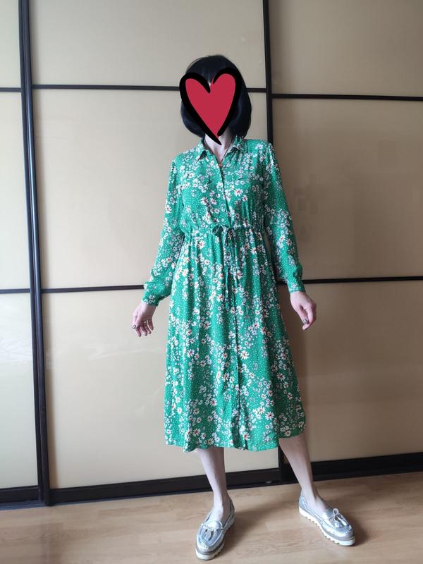 Сукня сорочка міді довгі рукави зелене в принт квіти