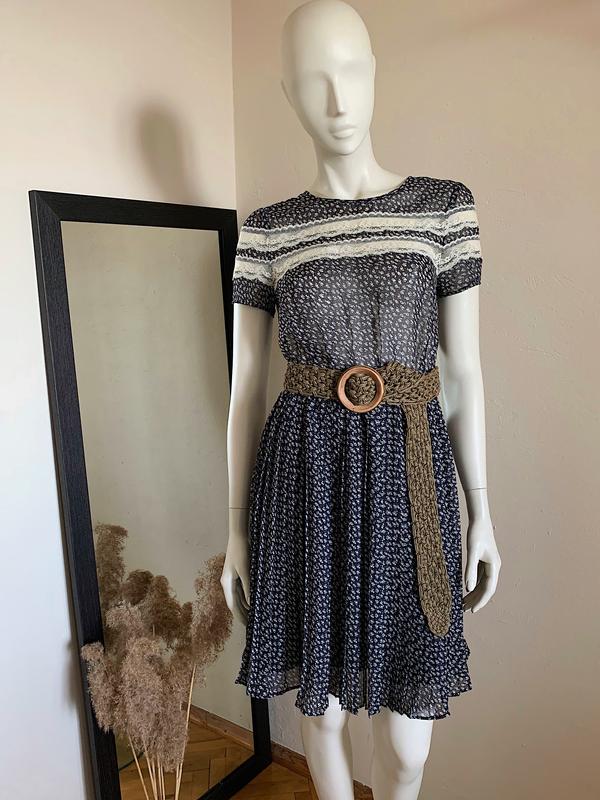 Женственное шифоновое платье от бренда Topshop в цветочный принт. Вставки из кружева, плиссированая юбка на подкладке. Цвет темно-синий. Состояние нового.
