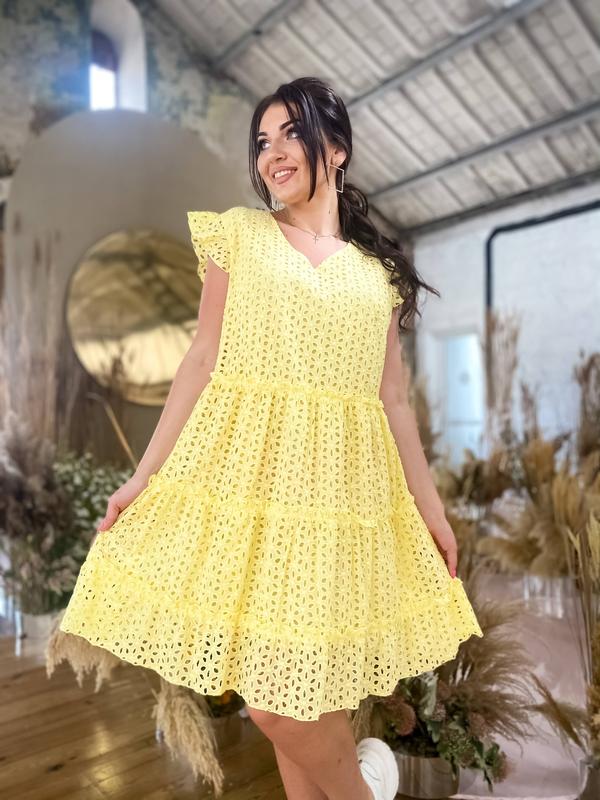Сукня прошва ✨Модель №с41459 ✨Небесний-42/44,46/48,54/56 ✨Банан-42/44 ✨Фрез-42/44 ✨Чорний-42/44,46/48 ✨Білий-46/48 ✨Тканина:прошва+підклад 100% коттон Заміри: Розмір 42-44(1) ог-96,от-92,ос-124,довжина-87 Розмір 46-48(2) ог-100,от-96,ос-140,довжина-89 Розмір 54-56(4) ог-120,от-112,ос-156,довжина-96