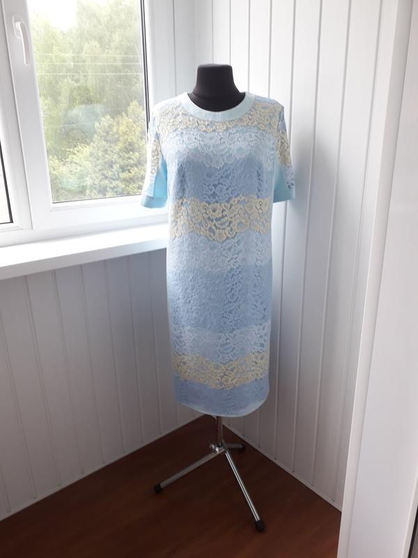 Нежное женское платье приталенного силуэта из тоненькой костюмки нежного голубого цвета и гипюра.За спинцв потайной замочек .Размер всего 56. Замеры ПОГ 56 ПООТ 54 ПОБ 59 Ширина плечей 42 Длина платья от плеча 106 Длина рукава 27 27