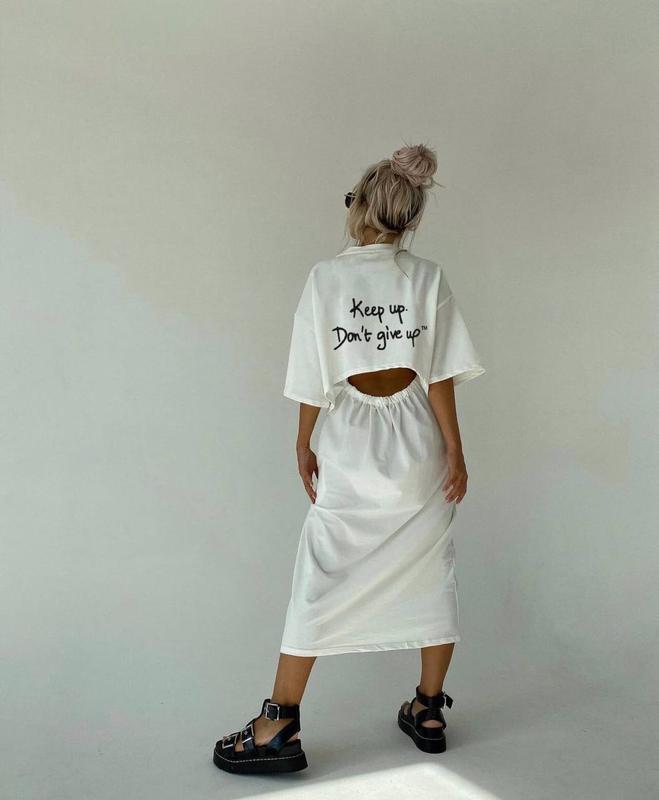 Платье Мод :318 ▪Ткань: двухнить ▪Размер: S-L(универсал) ▪Цвет: зелёный, белый, чёрный, лиловый Платье свободного кроя спереди, сзади по линии талии резинка, открытая спина.