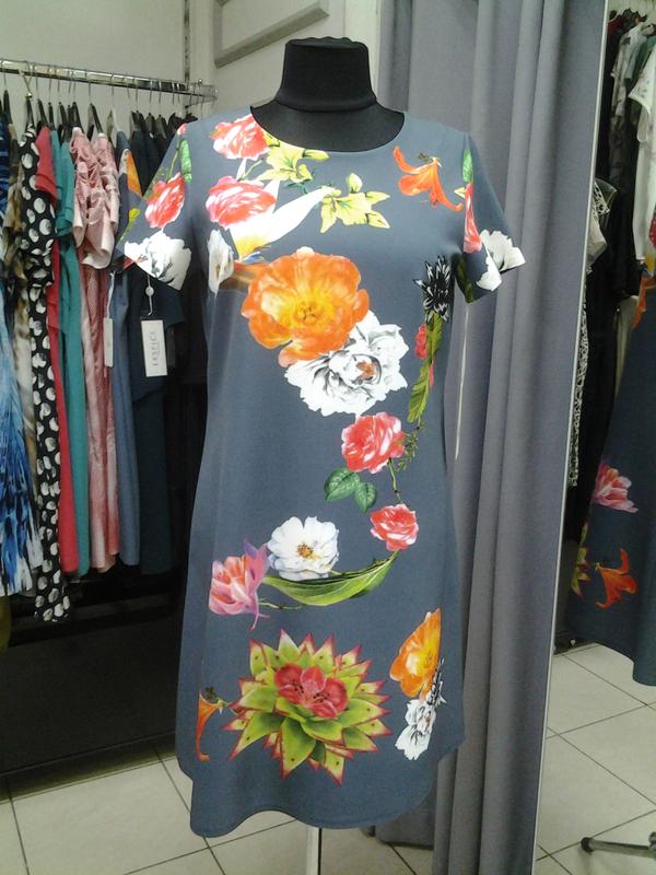 Платье, силуэт трапеция, длина ниже колена. Платье из трикотажной формоустойчивой ткани. Расцветка яркая, основной фон сероголубой. Платье хорошо одевается на фигуру"груша"