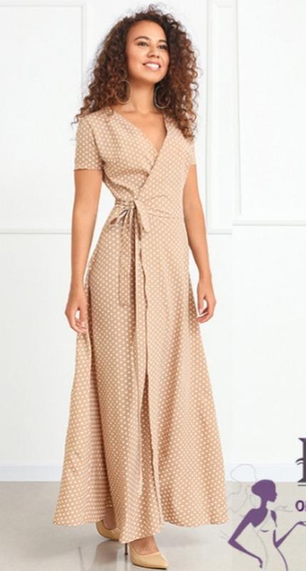 Плаття в горошок з розпорочкою на нозі,талія на резиночці+ поясок,тягнеться.Тканина турецький софт,довжина-122см,пог-42см,.Колір-мокко.