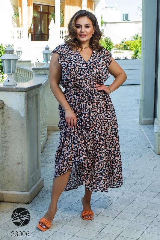 Платье с запахом из качественного коттона. Ярусный дизайн, глубокий вырез, отделка оборками, на талии резинка. В комплекте пояс из основной ткани.