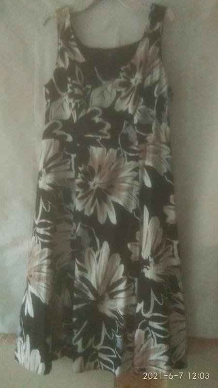 Літнє плаття без рукавів. Красивий квітковий принт. На підкладці. Відрізна по талії (ремінь на фото мій). Не носилося. Матеріал верху: 100% бавовна. Вказаний розмір 16. Заміри: ДІ від вирізу спинки до низу 94 см, ПОТ 40/41 см, ПОБІДИ 50/52 см, ПОГ 50/52 см, відстань між пахвами 48/49 див.