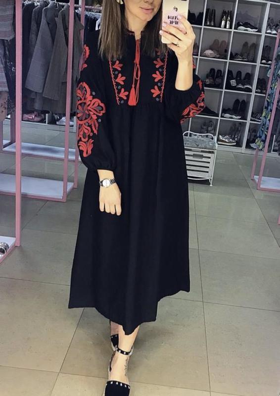 Етнічі речі завжди в моді. Плаття з 100% бавовни, грубий бавовна, машинна вишивка комірець і довгий рукав з рослинним геометричним орнаментом-вишивкою. Рукав знизу зібраний. Виріб має дві довгі зав'язки, які затягують комірець. кольори: чорний, білий, синій Розмір єдиний-універсальний. ... Блуза - довжина 60, рукав від горловини 64, пог 52 ... Плаття міні {85 см} ПОГ 46 см, плечі 38 див.,пояс 43 см ...Плаття міді {115 см} ПОГ 46 см, плечі 38 див.,пояс 43 см ♦️додаткові фото по кожній моделі пришлю в приват♦️
