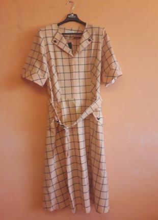 платье ярко бежевого цвета в нежную чёрную клетку, по талии отрезное, на добротном пояске, к низу юбка расклёшенная, рукав короткий, пошив очень качественный, вырез треугольником, украшенный пуговицами, также два кармана украшенные такими же металлическими пуговицами, размер 54 украинский, ОГ-108см., ПОТ-44см., ОБ-114, длина рукава-32см.,состав-75%-полиэстер, 20%-вискоза, 5%-спандэкс, производство Беларусь, новое