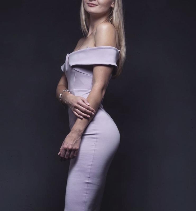 Шикарное платье миди с открытыми плечиками и вырезом Покупала на фотосессию