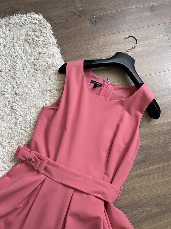 Сукня у яскраво рожевому кольорі. 42 розмір. Є кармани. Застібається на блискавку. Також є пояс, застібається на два гудзика (є на фото). Є додаткова підкладка. Довжина мді