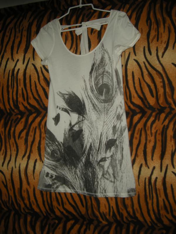 Шикарное платье фирменное,натуральное,на белом фоне серо-черные перья,большой вырез,сзади завязывается на бант,объем груди-84см.,длина-83см.